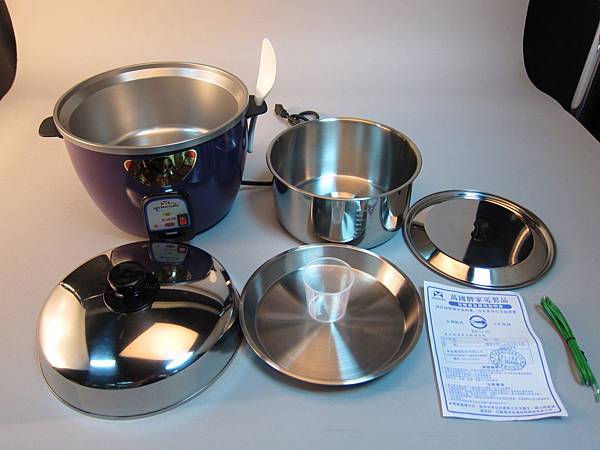▲完整內容物,包括鍋子、鍋蓋、飯匙、內鍋、內鍋蓋、蒸盤、量米杯、保證書、接地線
