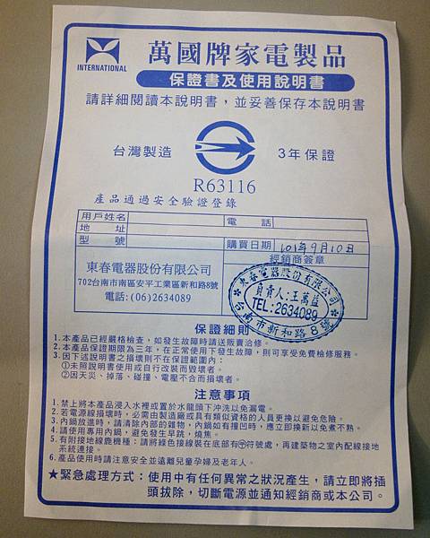 ▲保證書上面再度標示台灣製造3年保固,三年內有問題都可以免費維修,現在沒幾家電鍋敢喊三年保固的,可見萬國電鍋對自己品質很有信心